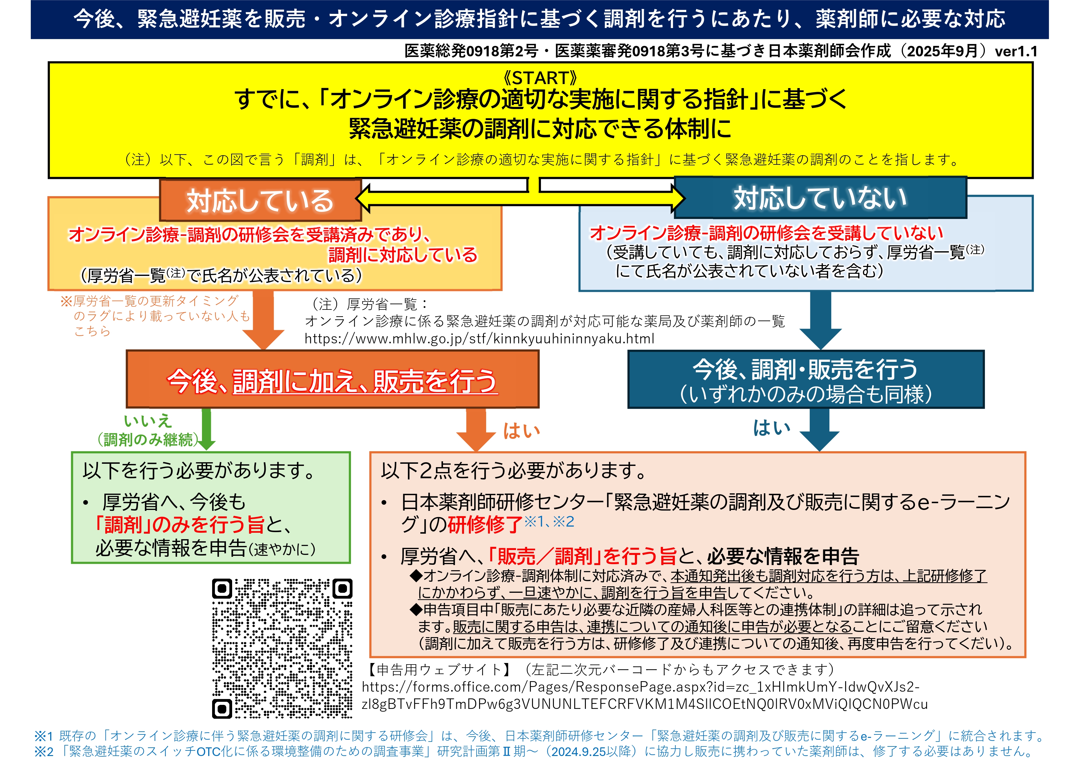 1については、今後、都道府県薬開催の「オンライン診療に伴う緊急避妊薬の調剤に関する研修会」は本年10月31日をもって廃止となり、公益財団法人日本薬剤師研修センターが実施する「緊急避妊薬の調剤及び販売に関するe-ラーニング」(9月19日開始)へ移行することになりましたので、何卒よろしくお願い申し上げます。なお、e-ラーニング受講の場合も自己研さんのみを目的には受講できません。